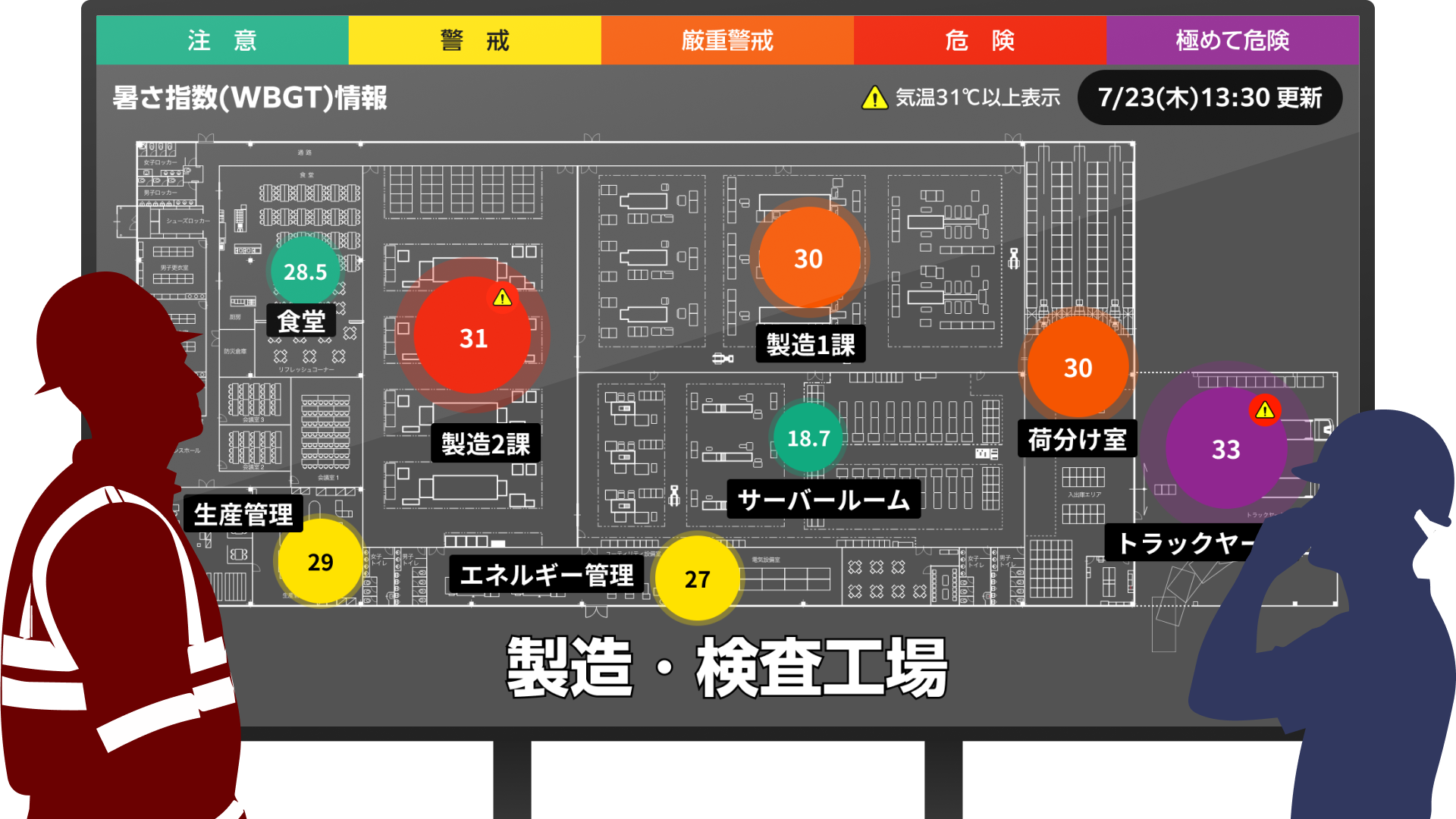 計測した暑さ指数(WBGT ※3)データを、お客様ご自身の建屋図面や現場の「見取り図上に可視化」できるサイネージコンテンツです。「どこが、どれくらい暑いのか」を直感的に共有し、現場の熱中症対策を強力にサポートします。